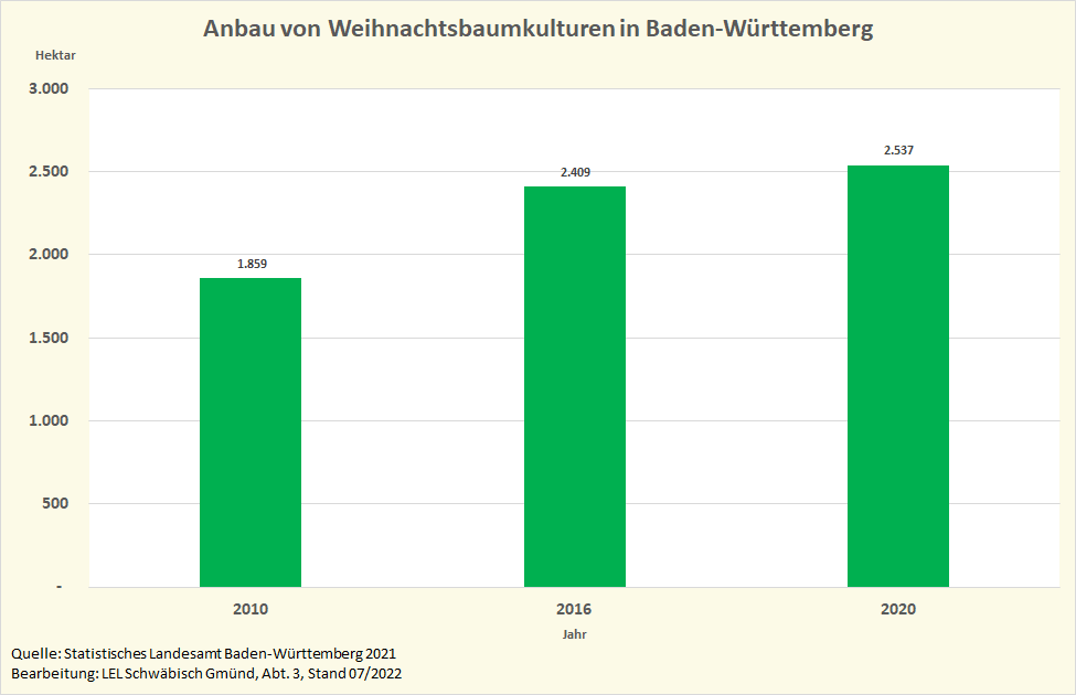 Das Statistische Landesamt Baden-Württemberg erfasste zum letzten Mal im Zuge der repräsentativen Bodennutzungshaupterhebung 2020 rund 2.500 ha Weihnachtsbaumkulturen. Die Bodennutzungshaupterhebung wird bundeseinheitlich auf Grundlage des Agrarstatistikgesetzes durchgeführt. Die Erfassungsgrenze für Weihnachtsbaumkulturen als Dauerkulturen liegt bei 1 ha Fläche.