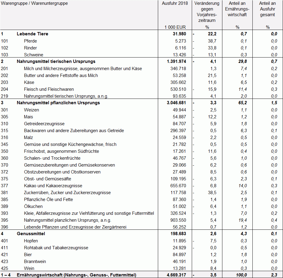 Tabelle: Ausfuhr Baden-Württemberg 2018 nach Warengruppen und Warenuntergruppen der Ernährungswirtschaft und der