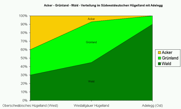 Wogegen im Mittelalter hauptsächlich Ackerbau betrieben wurde, ist mittlerweile nur im westlichen Oberschwäbischen Hügelland der Ackeranteil noch vorherrschend. Gegen Osten nimmt der Grünlandanteil stetig zu, bis er im Osten des Westallgäuer Hügellandes auf nur 2 – 4%, die im wesentlichen mit Mais bestockt sind, abfällt, und auf der Adelegg keine Rolle mehr spielt. Hier prägt die Waldnutzung den Bezugsraum. Auch Grünland ist hier nur im Süden und Westen des Gebiets im Tal der Unteren Argen und auf den Hochflächen zu finden.